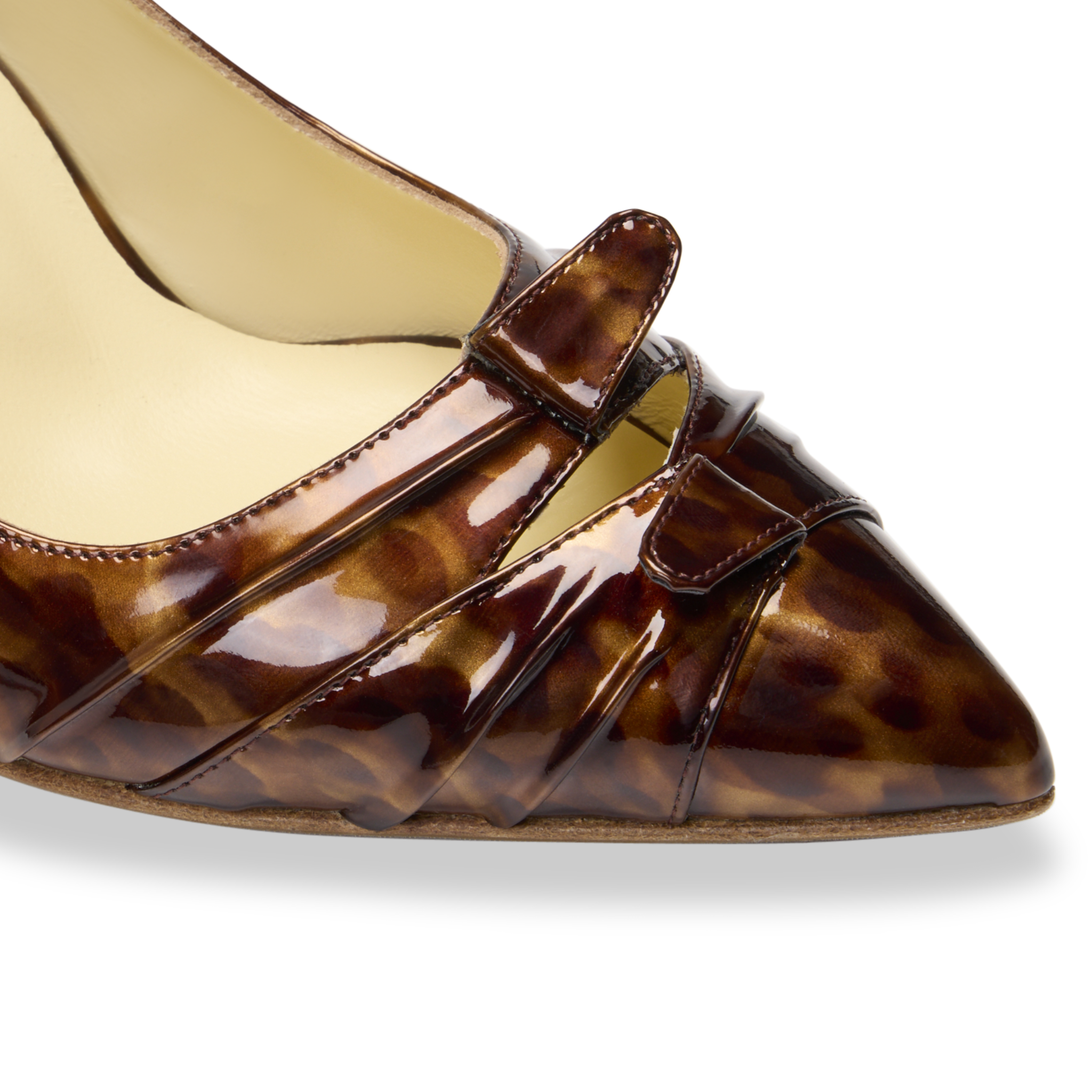 A sleek, block-heel pump in stone grey suede, crafted with origami-inspired pleating and a signature bow buckle ankle strap.