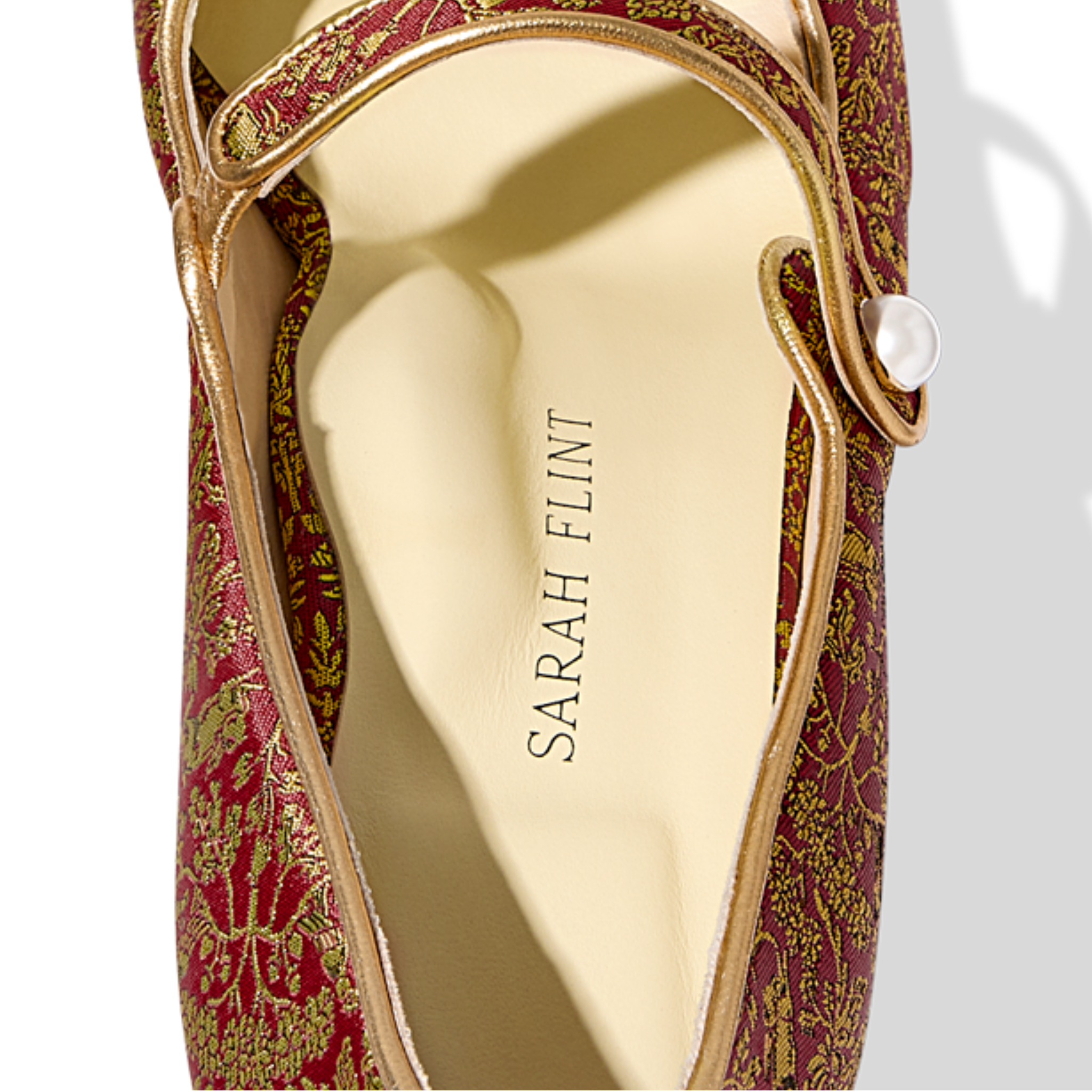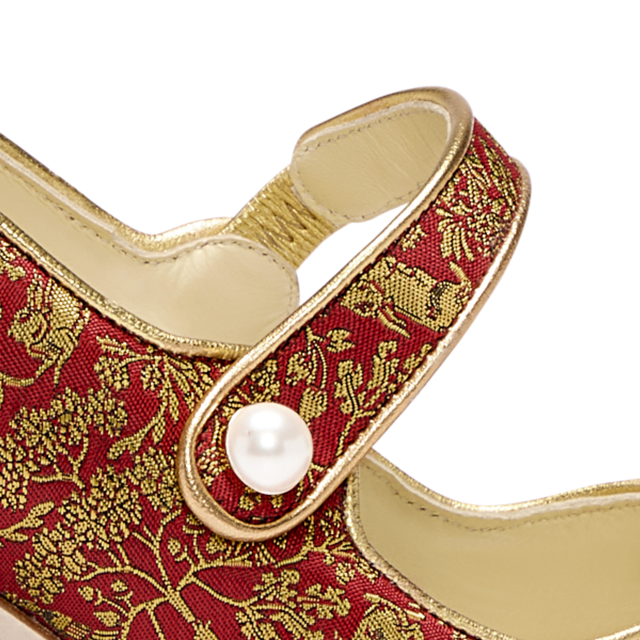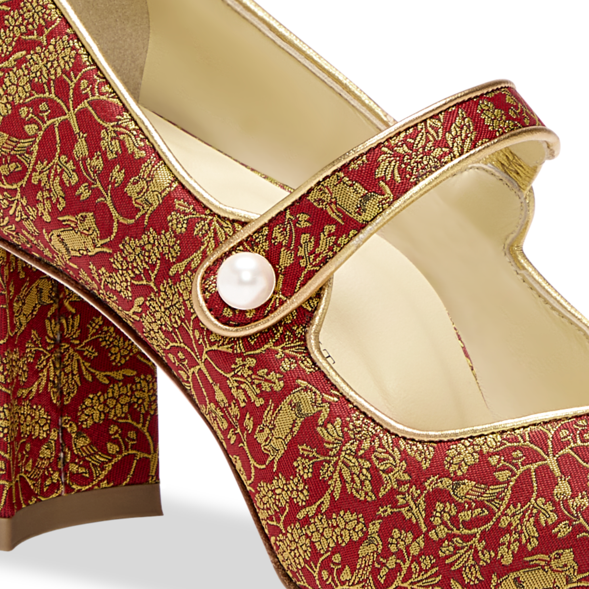 Inspired by Vienna's Schonbrunn Palace, this pump features ornate florals that evoke jewel-tone furnishings and brocade-covered walls. For an opulent finishing touch: a decorative, pearl-like button as if plucked from a regal wardrobe.