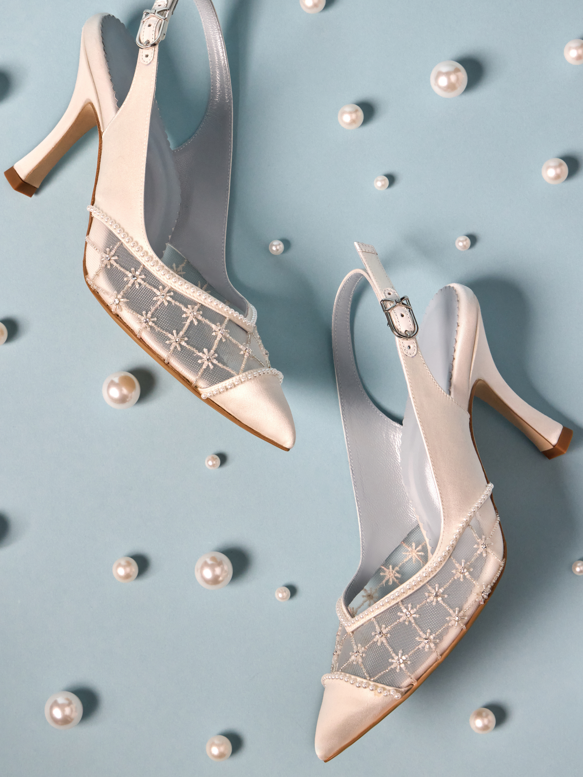 Crafted in luxurious white satin with a delicate "Something Blue" lining and scalloped edge, this slingback adds a personal, romantic touch. Hand-beaded and intricately embroidered, every detail celebrates the beauty of your wedding day while ensuring a timeless, elegant look you can cherish long after.