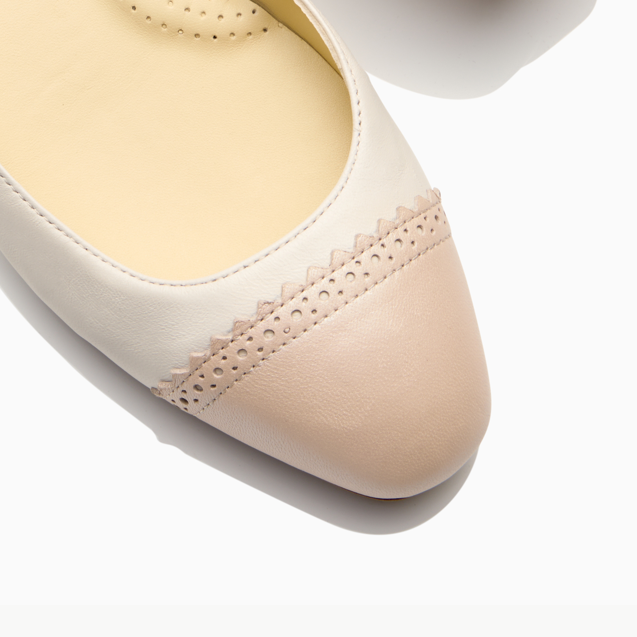 Squared off cap toe with contrasting fabrication and feminine brogue detailing