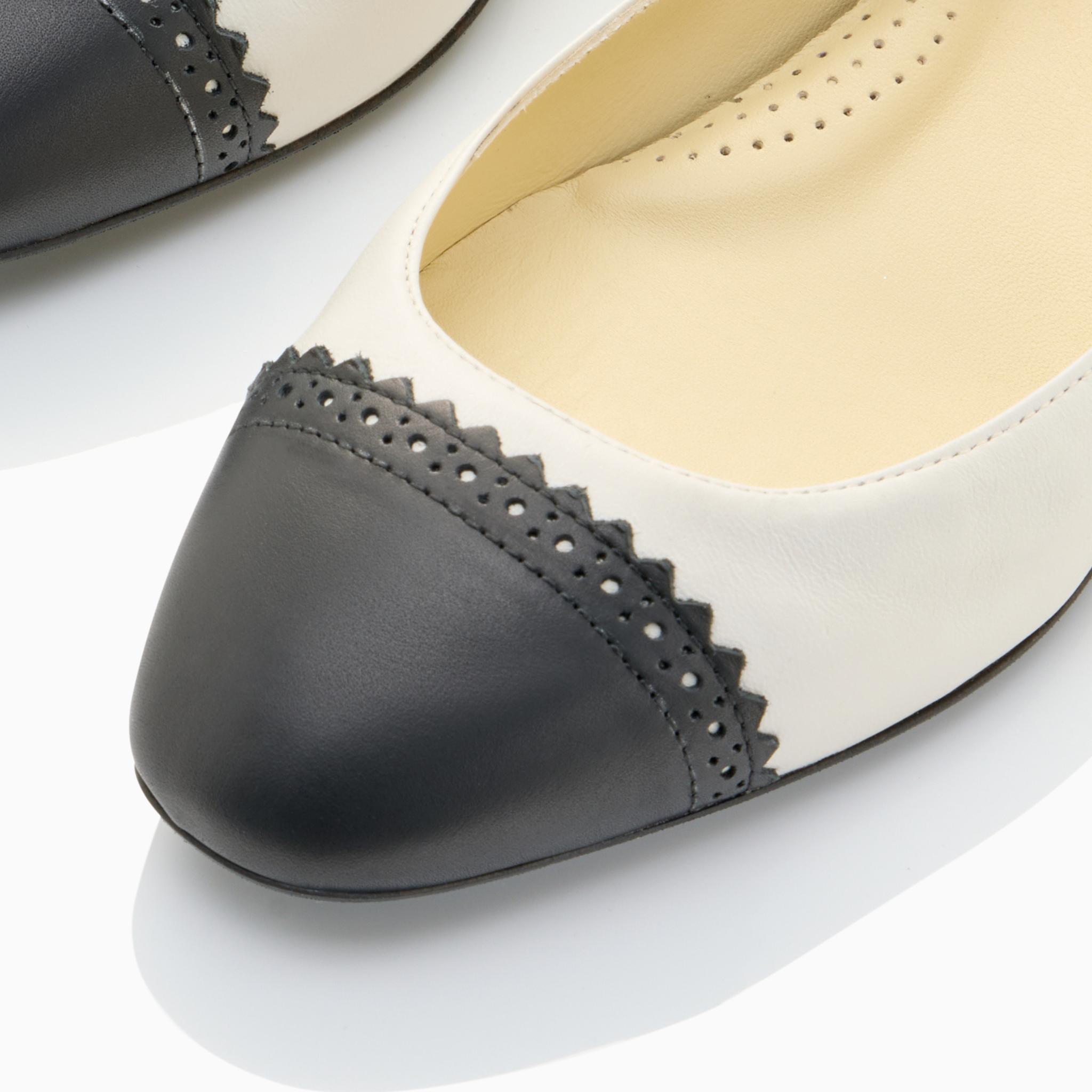 Squared off cap toe with contrasting fabrication and feminine brogue detailing